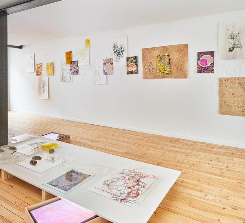 Aux confins des règnes du vivant, le lichen avait tout pour séduire l’artiste dont la pratique manifeste le lien entre l’espace et le corps et décloisonne les existences. Ainsi, elle fait émerger ce qui nous unie… une autre taxonomie qui s’exprime au travers de ses œuvres. Lors d’une résidence, l’atelier devient en quelque sorte un laboratoire d’expérimentation… rapprochant plus que jamais l'esprit artistique de l’esprit scientifique. Ici, l’artiste sort de sa zone de confort, prend des risques et repousse les limites de la connaissance… de soi et du monde. Les idées prennent la forme de tests, d’investigations et de spéculations qui, dans l’alchimie des formes et des couleurs, dessinent ensemble le chemin vers de nouvelles communications. Nadine Lahoz-Quilez ne s’y est pas trompée… en “touchant” au lichen, elle a ouvert la porte sur une nouvelle dimension qui autorise autant la continuité que la rupture avec l’existant… d’inextricables réseaux en nous et autour de nous.