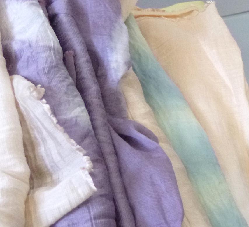 Toutes les teintures ont été effectuées à partir de végétaux et d'éléments collectés dans notre jardin partagé : sureau, oignon, bambou etc...