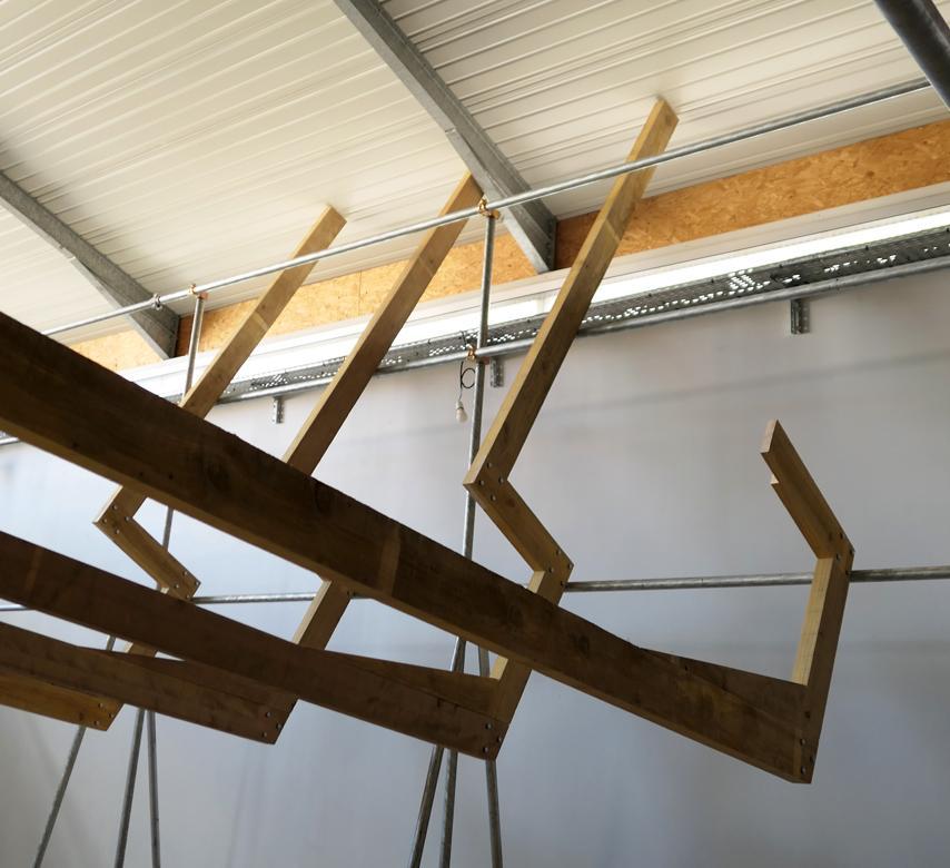 La structure physique et associative du centre d’art Aponia a intrigué Hidéo Morié. C’est une association loi 1901 qui œuvre en faveur des artistes depuis 20 ans. D’un point de vue architectural, c’est une ancienne menuiserie avec un grand toit. Tout semble installé, rodé, parfaitement équilibré, tant sur le plan de l’organisation que sur l’architecture établie de longue date. L’équilibre étant, si l’on prend l’exemple d’une balance, le moment où rien ne bouge, ni à gauche, ni à droite. Ainsi l’équilibre est sans relief, c’est le calme plat.