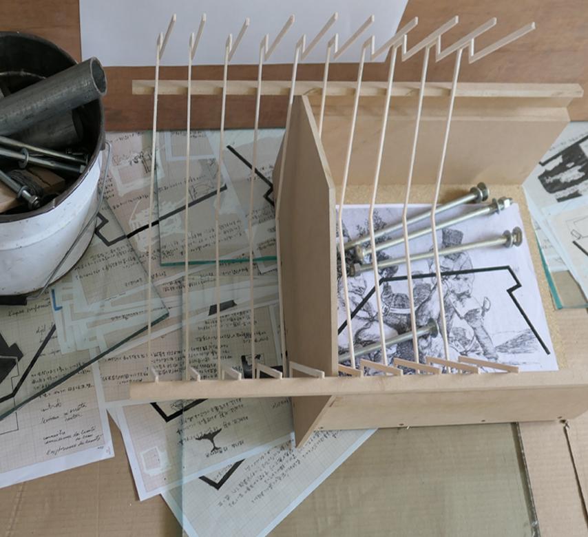L’année suivante, en 2014, je proposais encore à Hidéo Morié et à son comparse, Tomoya Eguchi de participer à une exposition que j’intitulais : « La déconstruction des schèmes ». Je trouvais adaptées au concept de l’exposition ses recherches sur le décalage du réel, un pas de côté, comme un danseur qui donne à voir un autre aspect du mouvement et de l’espace. Dans ce projet, Hidéo Morié avait installé de grandes structures de bois blanc soutenues par des barres en métal quasiment collées au mur et qu’il fallait enjamber. Il forçait le spectateur à choisir un chemin à droite, à gauche ou tout droit, mais pas très large et rempli d’embûches, une œuvre impossible à réaliser dans un musée officiel, puisque ne respectant aucune close liée à l’accessibilité et à la sécurité des visiteurs. Dans sa présentation, Hidéo Morié indiquait que le mot « Salaisons » contenait le mot « sons » et qu’il avait donc choisi par mimétisme une réouverture sonore du lieu « New Salaisons » en quatre compositions de musiques contemporaines, trois de John Cage, dont l’une s’intitulait : Atlas Eclipticalis.